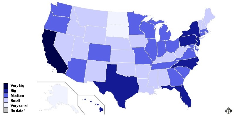 As our data included information on the States of America we decided to include these as well. The east coast combined is slightly larger than the west coast, but California is clearly the largest state.