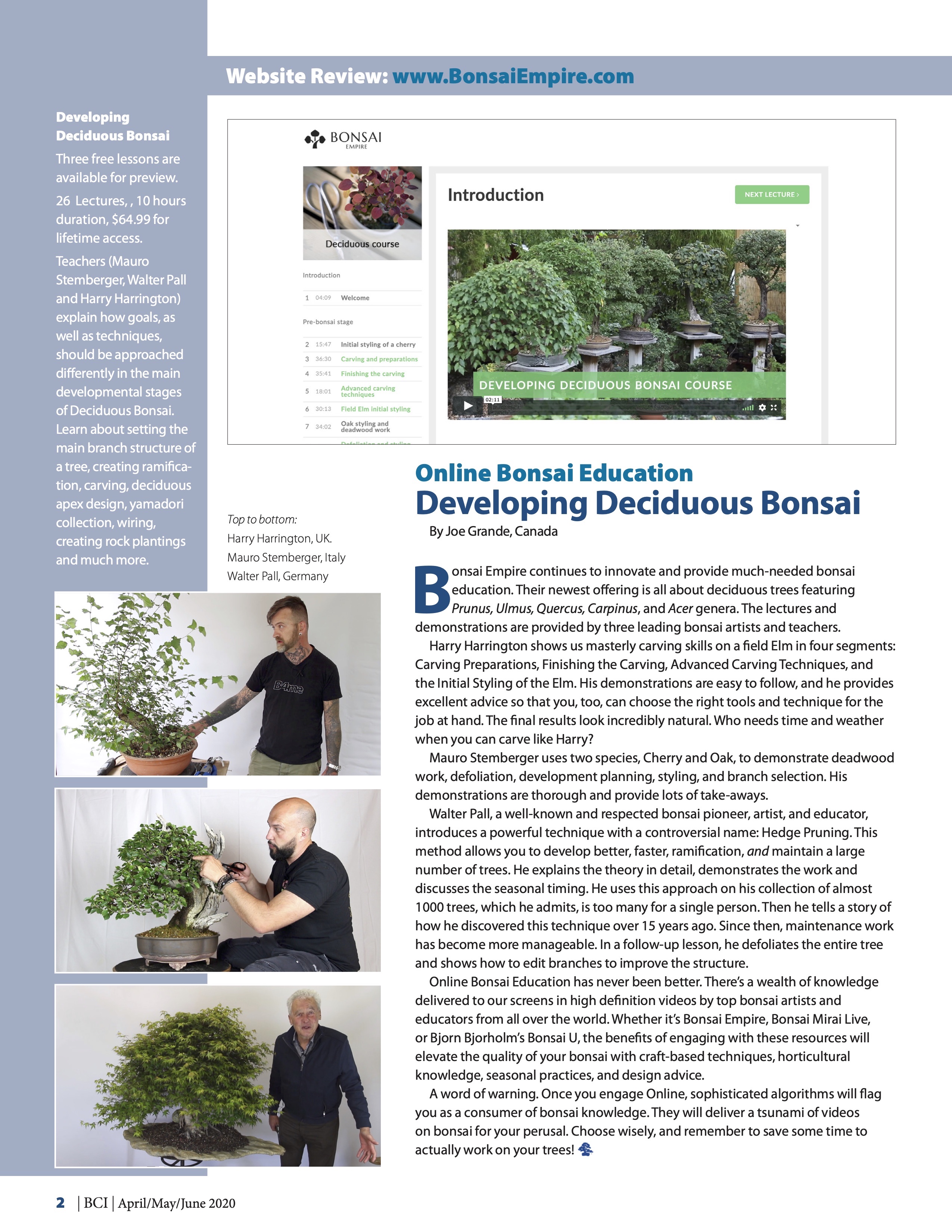 The Developing Deciduous Bonsai course is centered exclusively on Deciduous and Broadleaf evergreen tree species. The teachers (Mauro Stemberger, Walter Pall and Harry Harrington) explain how goals, as well as techniques, should be approached differently in the main developmental stages of Deciduous Bonsai. They show masterpiece Bonsai being worked on, but our focus is mostly on trees in the lower price ranges.